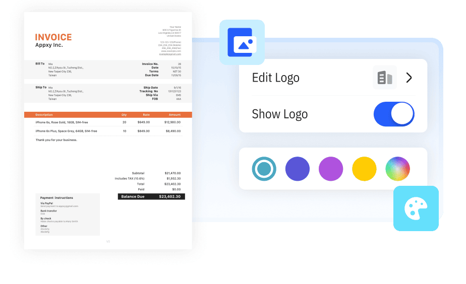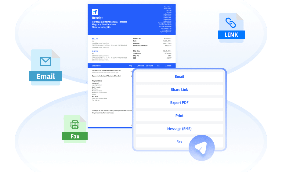 Create professional invoices with your logo, details, and branding.